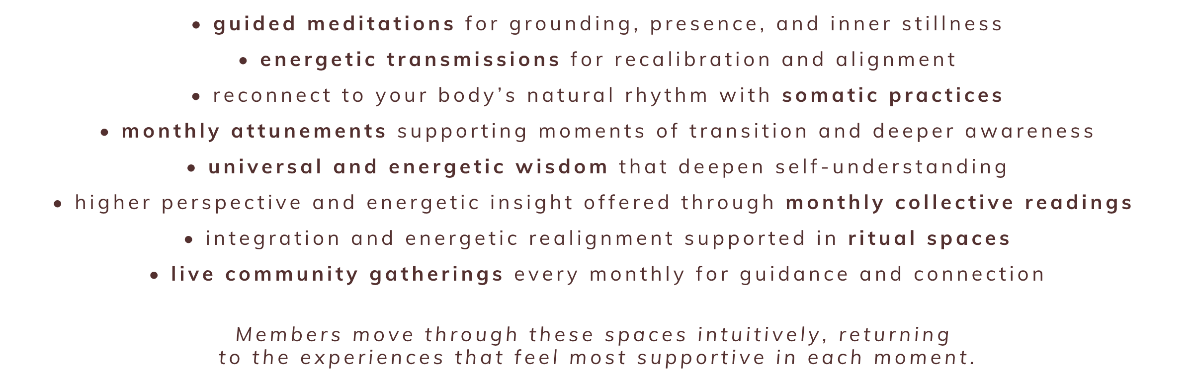 A private space where members walk alongside one another and gather monthly to receive live guidance, energetic support and connection.